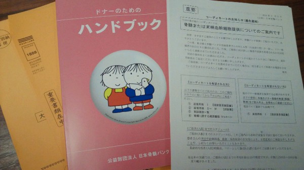 ついに来たっ!!! [掲載日]2016.04.20 今日… 通知が届きました。 『骨髄移植のドナー候補のひとりに選ばれました』と。 10年ほど前に献血のついでに登録したっきり、 全く連絡もなかったので忘れかけてたのですが… ついにっ!!! いざ来てみると、急な事もあってかなり動揺しますね(^o^;) が、せっかくなので希望してみる事にしました。 過去の病歴や今の健康状態の審査が厳しいようなので、 最後まで選ばれるかは解りませんが…。 コレからしばらくドキドキですっ(o>ω<o) 黒田店 m
